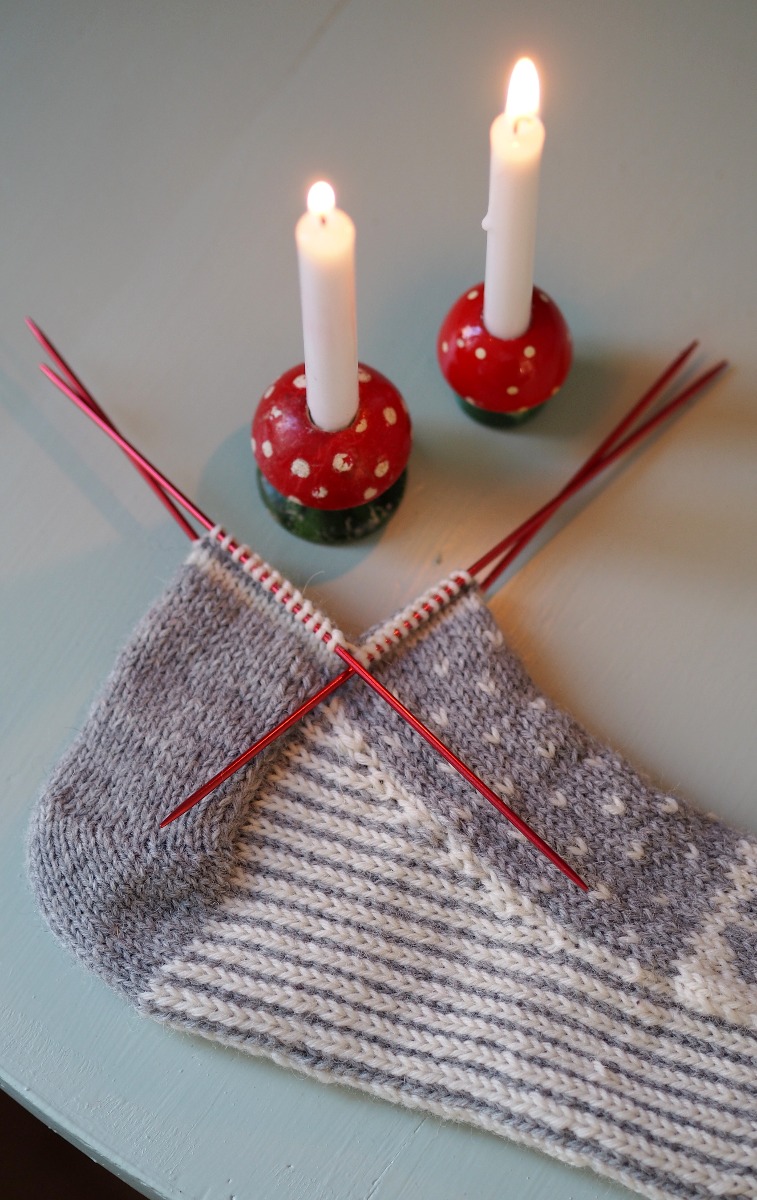 Så brenner endelig to lys – og vi får strikke videre på vår adventsstrømpe!