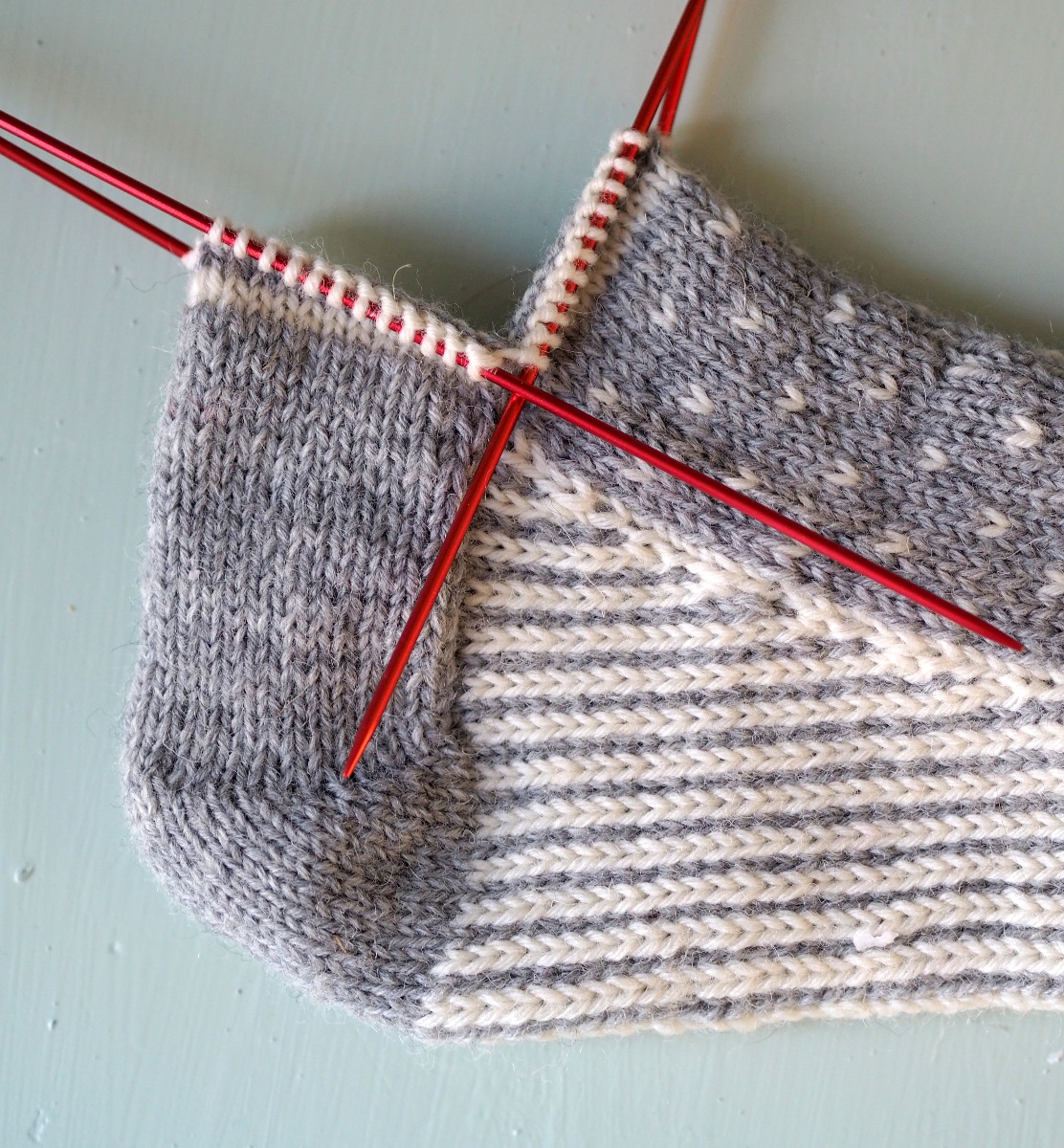 Nå skal hælen strikkes med farge 1, farge 2 får hvile (ikke klipp av garnet).