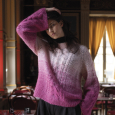 Akvarell er strikket med tre tråder tynn silke og mohair hold sammen med perlestrikk og fletter på bol og ermer. Du begynner i nakken og strikker frem og tilbake for å forme halsåpningen før du samler arbeidet og strikker videre rundt med en modifisert raglanøkning. Så deler du av for ermer og bol som strikkes hver for seg. Til slutt plukker du opp masker rundt halsåpningen og strikker halskanten.