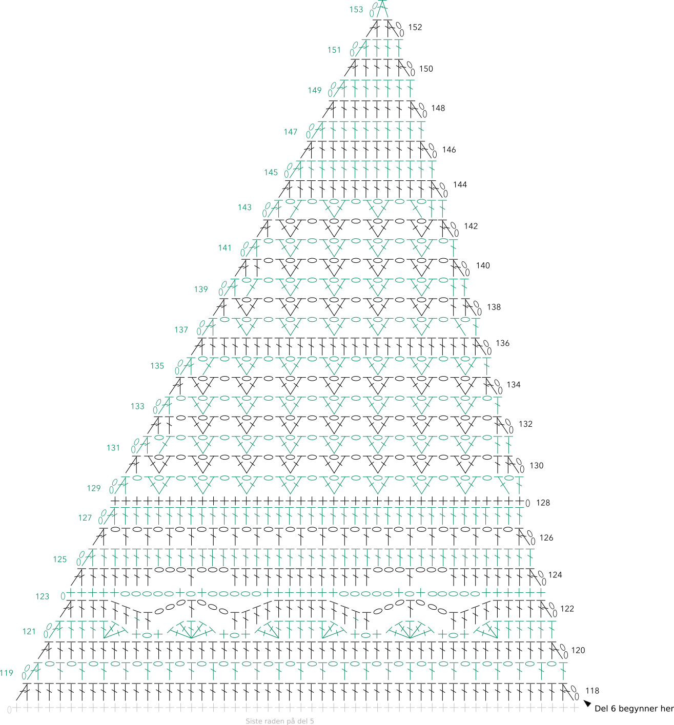 1 lm, 1 fm i hver av de neste 5 m, 5 lm, ho 3 m, 1 fm i neste 3-lmb, 1 lm, ho 1 m, 1 fm i neste 3-lmb, 5 lm, ho 3 m, 1 fm i hver av de neste 7 m, 5 lm, ho 3 m, 1 fm i neste 3-lmb, 1 lm, ho 1 m, 1 fm i neste 3-lmb, 5 lm, ho 3 m, 1 fm i hver av de siste 6 m på raden.