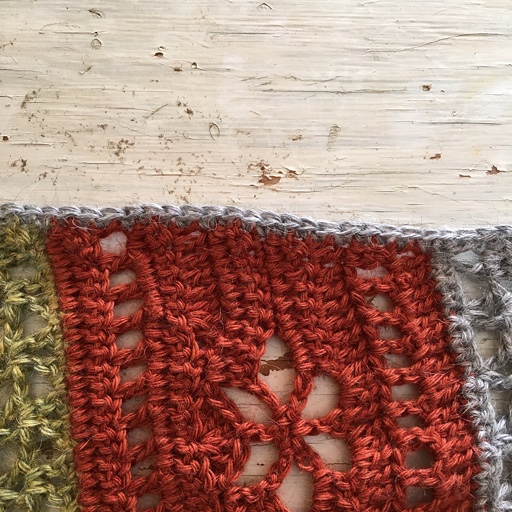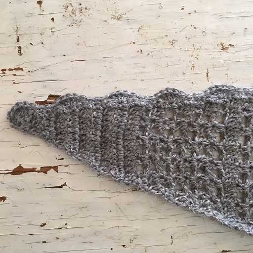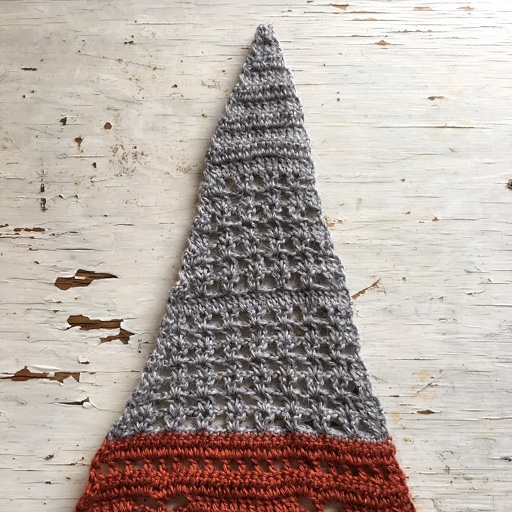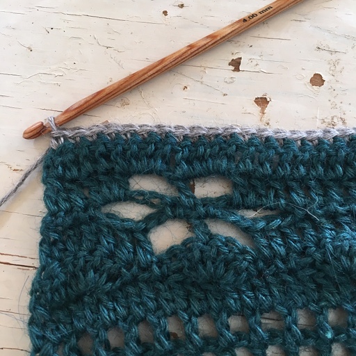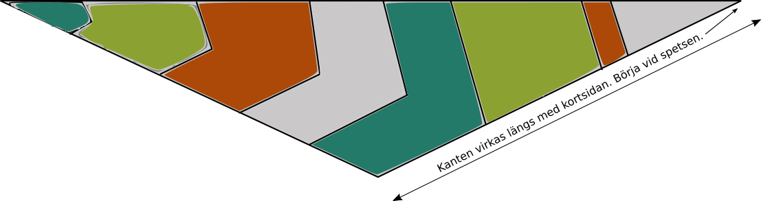 Begynn ute i spissen der det tidligere mønsteret sluttet og hekle langs hele kortsiden.