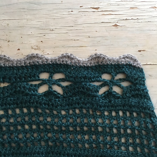 Vi fortsetter å hekle kant langs den ene kortsiden for å få en penere avslutning.