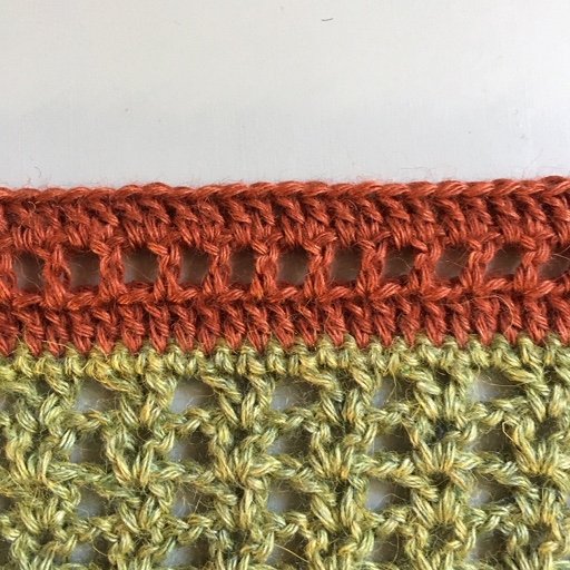 2 lm, hekle 2 st sm i de første 2 m, 1 st i neste m, *1 lm, 1 vm i neste vm*, gjenta *-* t.o.m. siste vm på raden. 2 st sm i de siste 2 m.