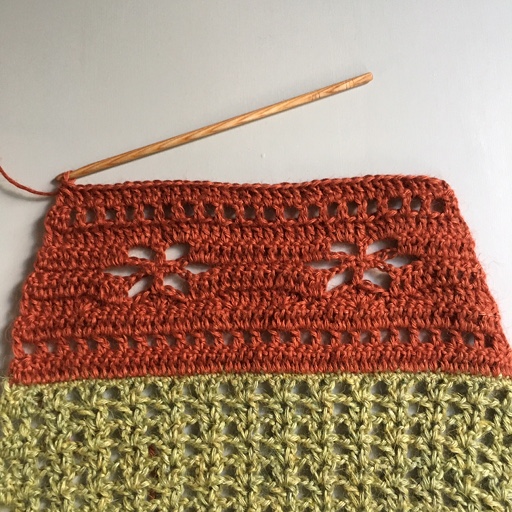 Hekle 1 lm, *ho 2 m, 5 st i neste m, ho 2 m, 1 fm i neste m, 1 lm, ho 1m, 1 fm i neste m*, gjenta *-* ut raden.
