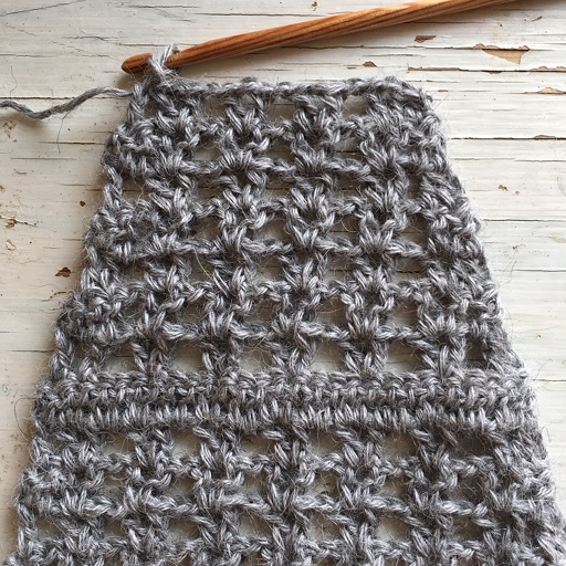 2 lm, hekle 2 st sm i de første 2 m, 1 lm, 1 st i neste m (rundt 1-lmb), *1 lm, 1 vm i neste vm*, gjenta *-* t.o.m. nest siste vm på raden. 1 lm, 1 st i neste vm, 1 lm, 1 st i hver av de siste 2 m (ene m er siste st[KMV1] i siste vm).