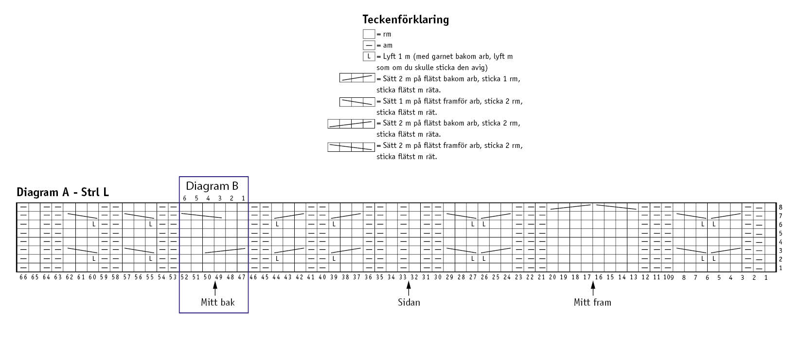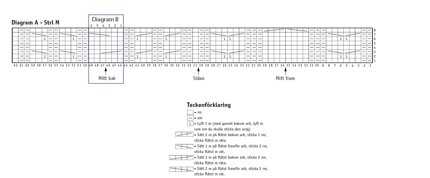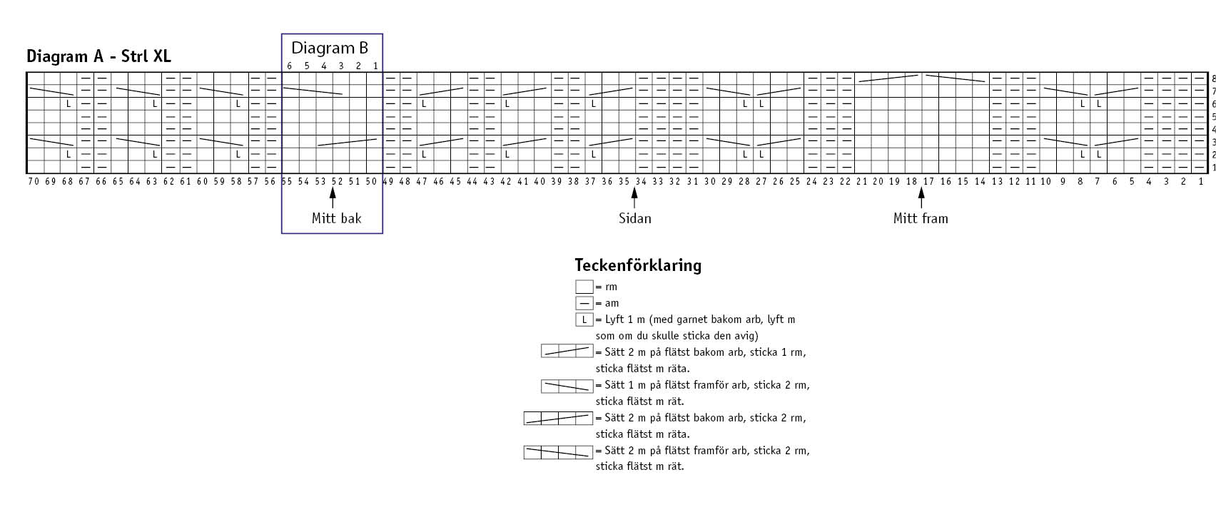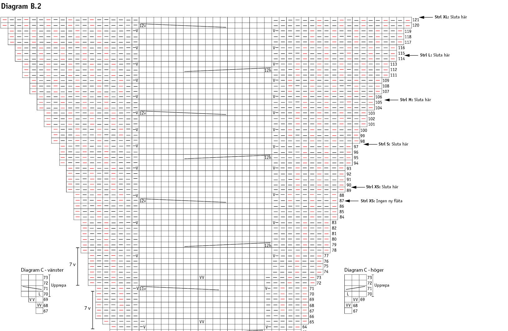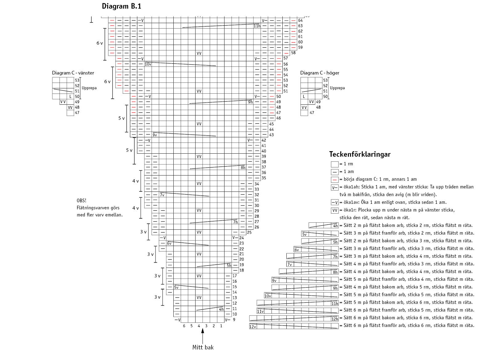 Deretter begynner økningene midt bak, og da følger du diagram B.1 og B.2 for de 6 m midt bak (det er disse som det økes i), diagram A strikkes før og etter, hele tidetrn likt, 1.-8. Omg. OBS! Etter 27. omg i diagram B blir det flere og flere omganger mellom fletteomgangene. Tips: Sett en markør i en fletteomgang så holder du rede på antall omganger.