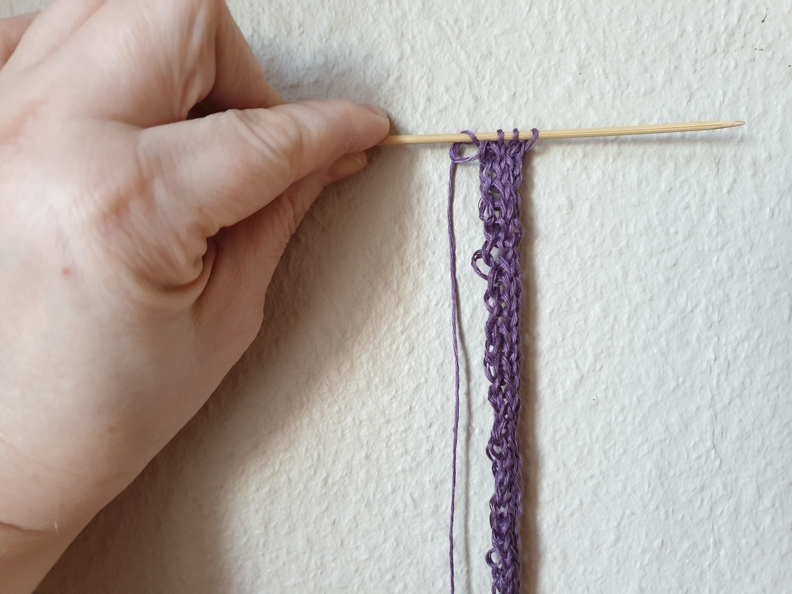 Nå skal vi plukke opp masker langs i-corden, nærmere bestemt én maske i hver pinne.