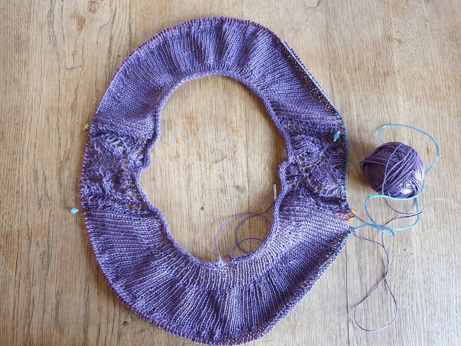 Nå er det endelig tid for å sette markører for hullmønsteret på ermene, begynne å strikke ifølge diagrammet og for alvor komme i gang med bærestykket.