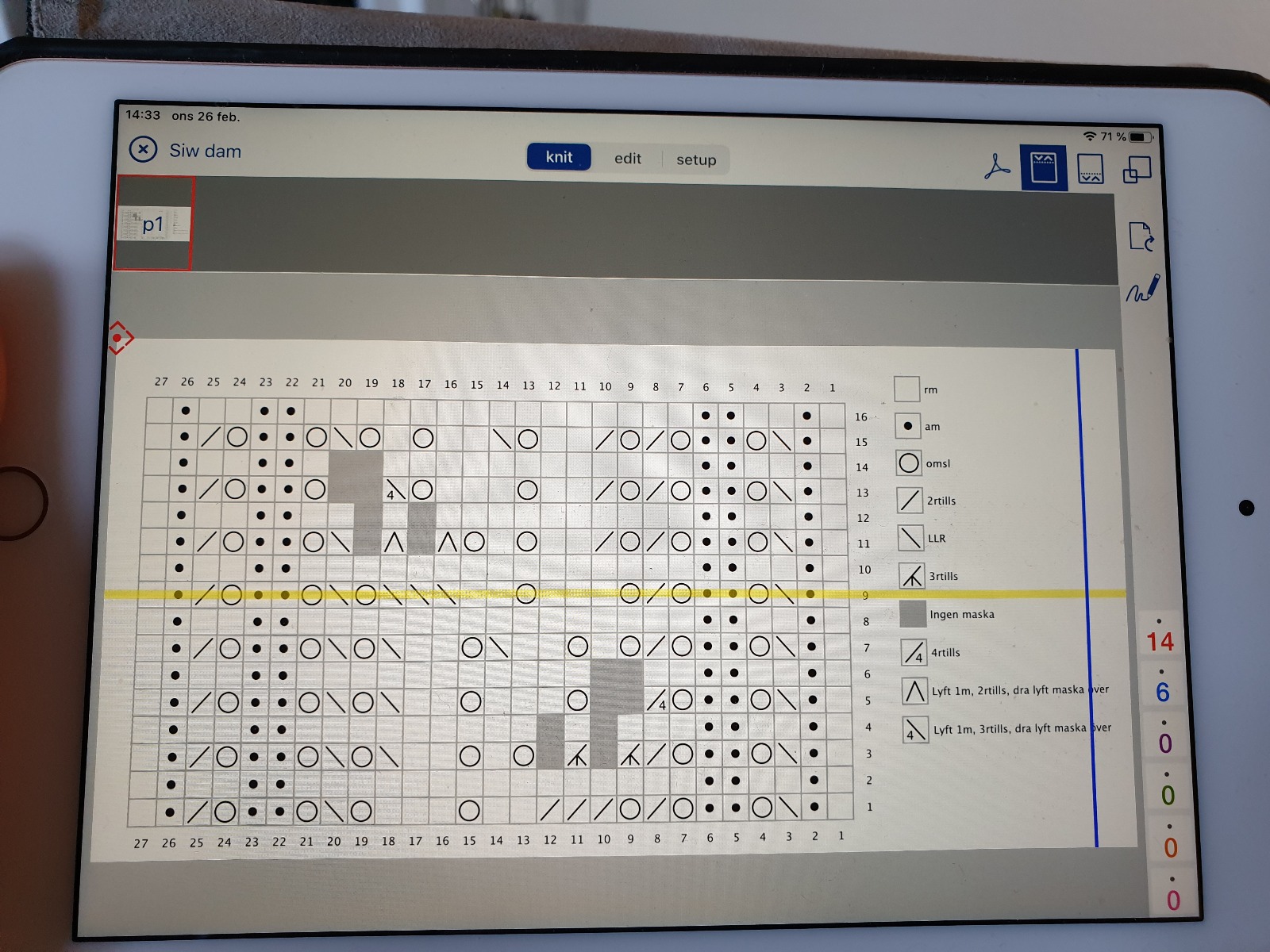 Alle har sine egne favorittmetoder for å holde rede på hvor man befinner seg i diagrammet, beskjedlapper er vanlig. Selv bruker jeg en app som heter KnitCompanion når jeg leser diagrammer. Appen er gratis og finnes både for Android og Iphone (du kan betale og få ekstra funksjoner, men det gjør ikke jeg). I appen finnes det pinne-/omgangstellere så du bare klikker hver gang du repeterer en pinne, da vet du enkelt hvor mange repetisjoner du har igjen (du ser dem lengst nede til høyre i bildet nedenfor), som når du skal repetere første pinne eller omgang flere ganger. Det finnes også en gul horisontal linje som lett kan flyttes og markere hvor du er. Neste gang du åpner appen, er den der du gikk ut av den, og du risikerer aldri å miste noe. Jeg bruker et ipad-nettbrett som har litt større skjerm enn en telefon, men appen funker selvsagt på begge alternativene. Alle mønstrene finnes som PDFer i Facebookgruppen. Her ser dere hvordan det ser ut når jeg bruker KnitCompanion: