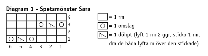 4.-11./15. omg: Strikk 0 (1) 2 r, deretter hullmønster Sara over 24 m, r ut omg.