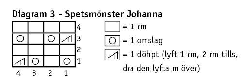 4.-11./15. omg: Strikk 0 (1) 2 r, deretter hullmønster Johanna over 24 m og så r ut omg.