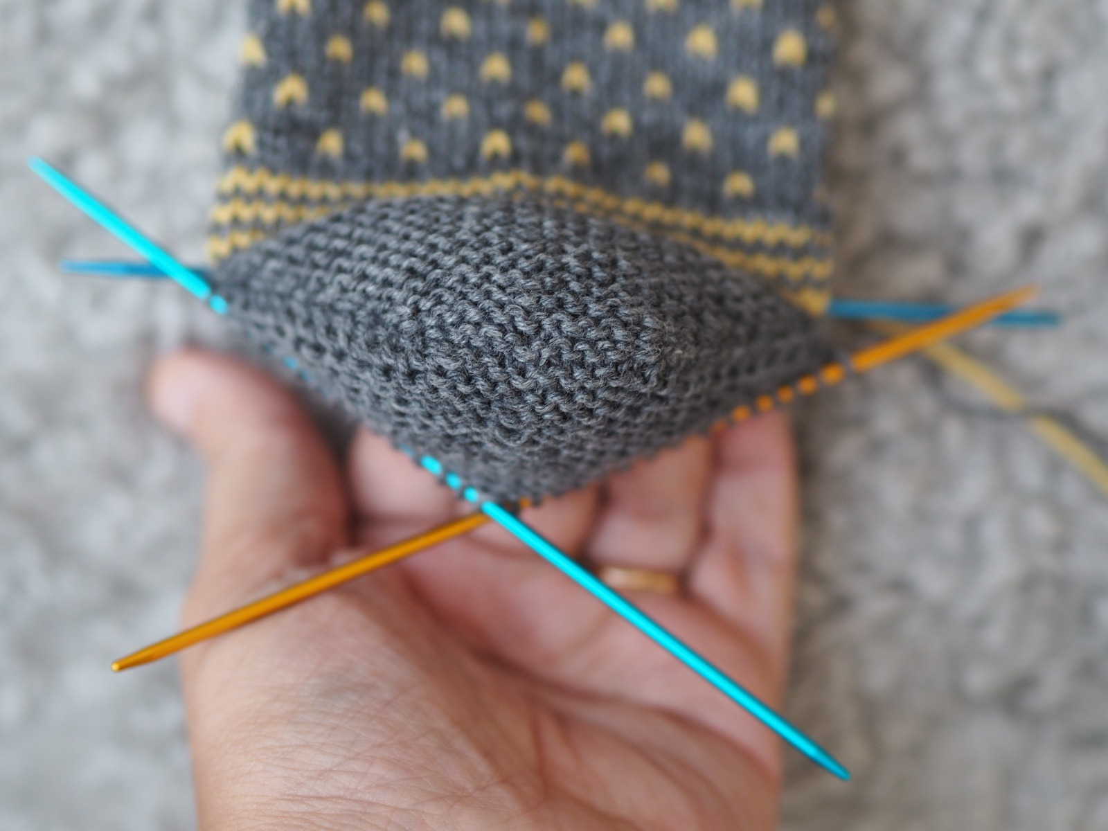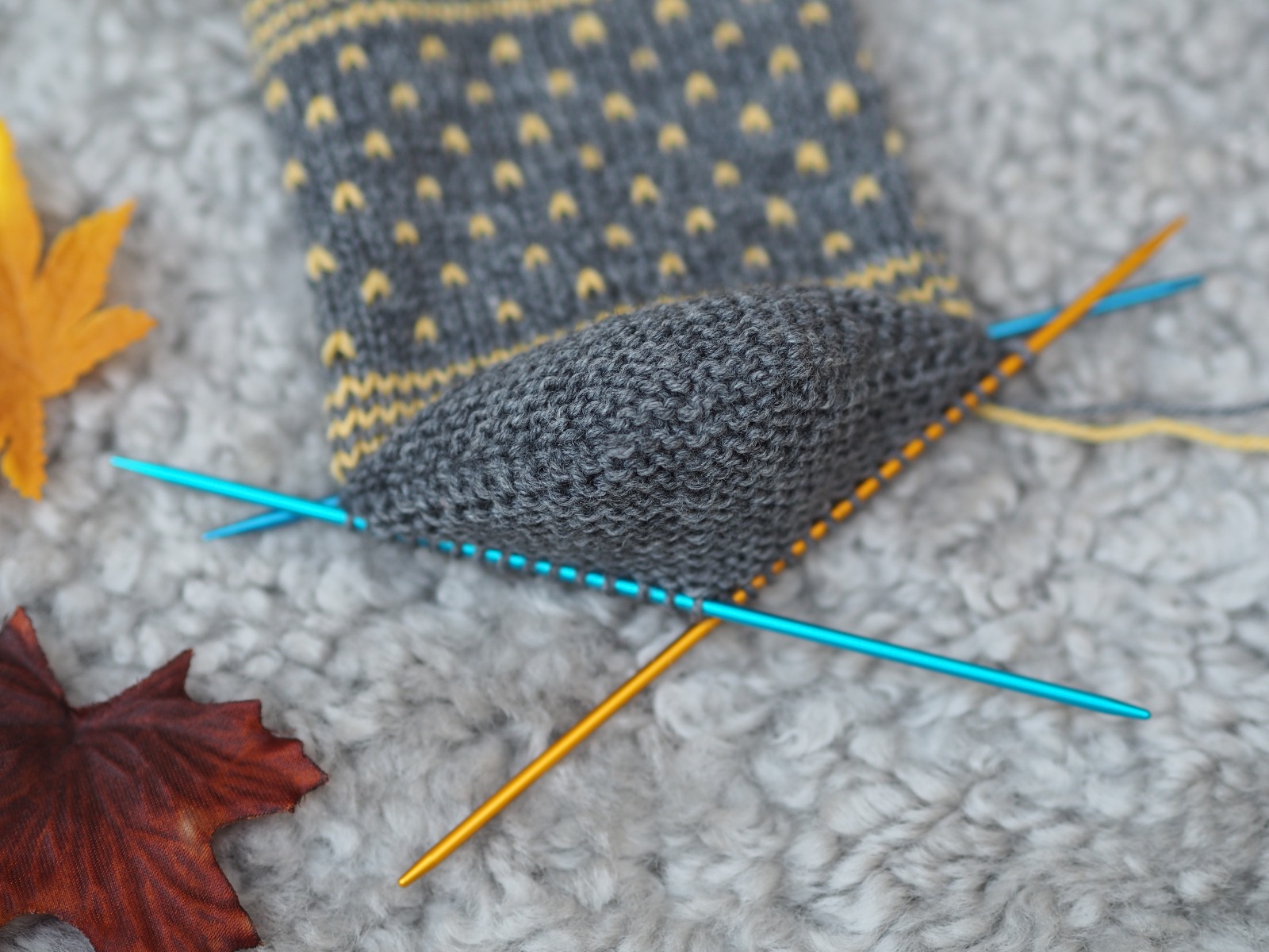 Nå er tiden inne for å gå i gang med sokkens hæl – nærmere bestemt en rillestrikket hæl med forkortede pinner. Rillestrikkingen kjenner dere igjen fra tåen – siden tanken er at hæl og tå skal matche hverandre strukturmessig.