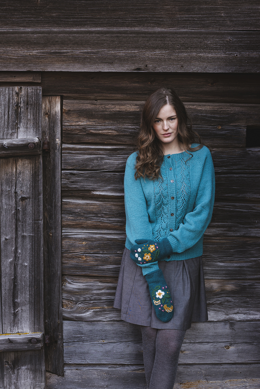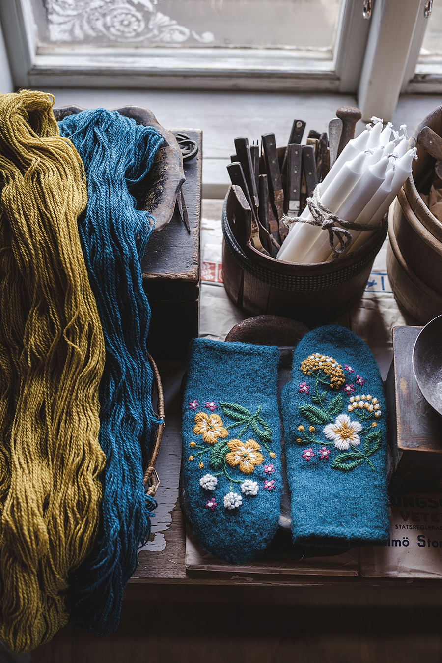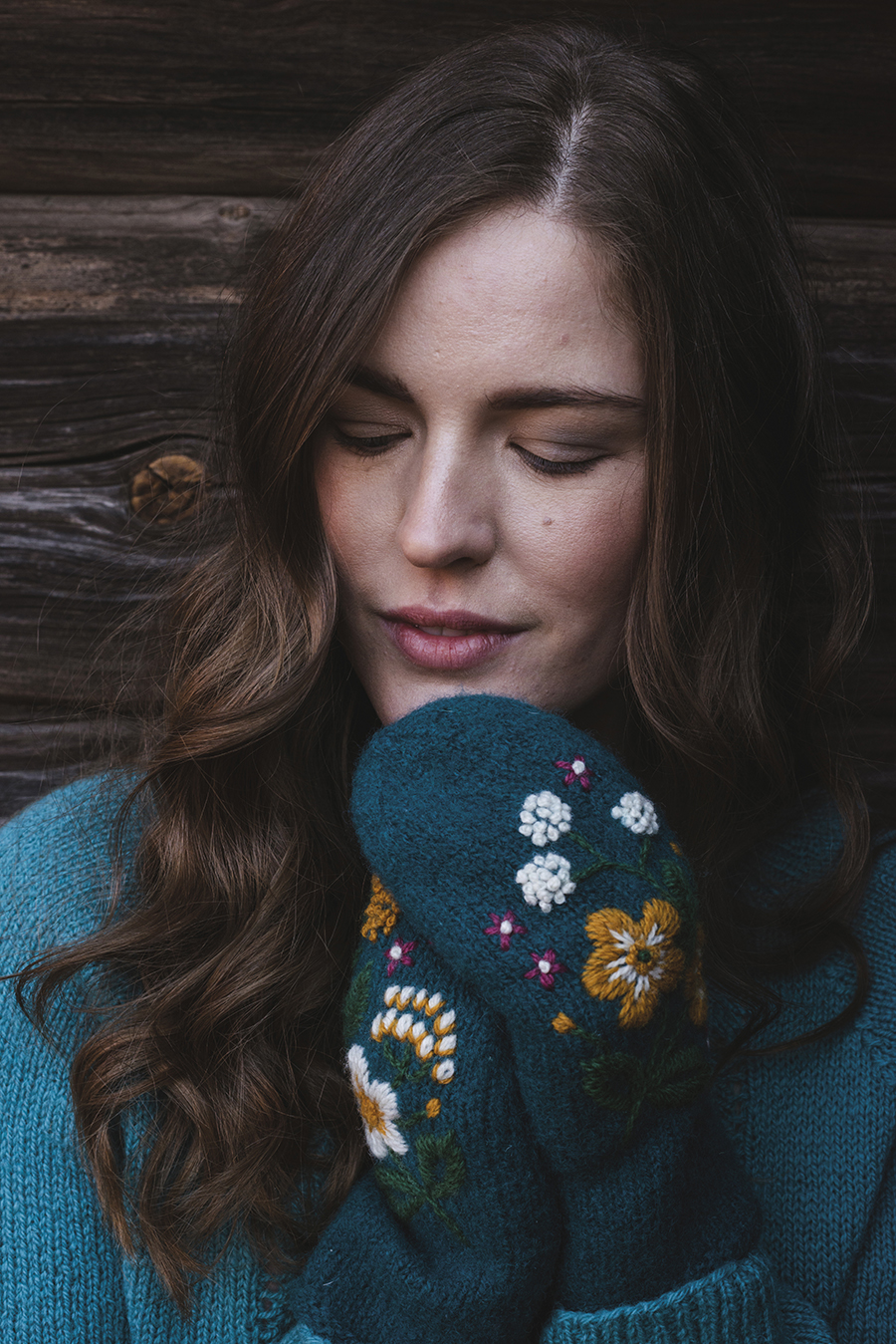 Når broderiet er ferdig, snur du vottene med vrangen ut og trekker tilbake alle løse garnender. Fest dem ved å træ dem på nålen, én om gangen, og "vev" dem inn på baksiden av broderiet. Klipp deretter av løse trådender, damp eller fukt votten og trekk litt i den for å få den jevn og fin. Lag så flere par – jo mer du broderer jo dyktigere blir du! Kanskje du også får ideer til egne mønstre å dekorere vottene med?