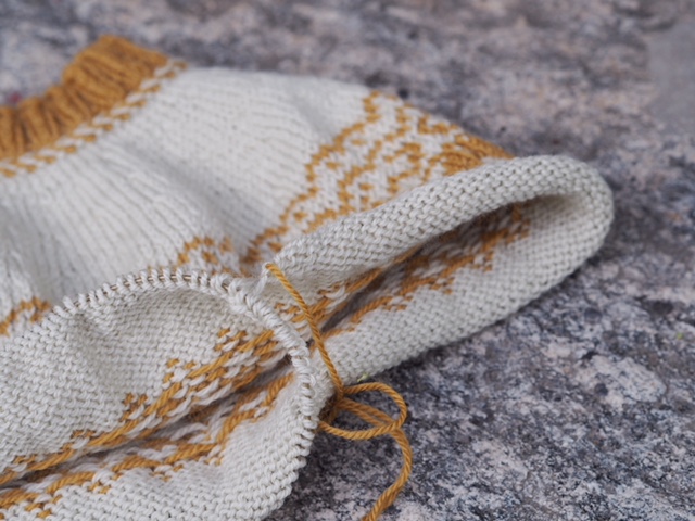 Når du har strikket bolen til angitt lengde, følger du instruksjonen for antall masker på omgangen som skal strikkes før du strikker inn den første tråden. Ta deretter en tråd av mønsterfargen eller litt restegarn, slipp bunnfargen og strikk 26 masker med den løse tråden. Når du gjort det, lar du den bare henge og går tilbake og strikker med det vanlige garnet. Strikk deretter videre over de 26 maskene som nettopp ble strikket med tråden i avvikende farge. Fortsett som forklart i oppskriften og strikk deretter inn en tråd til på motsatt side av jakken.