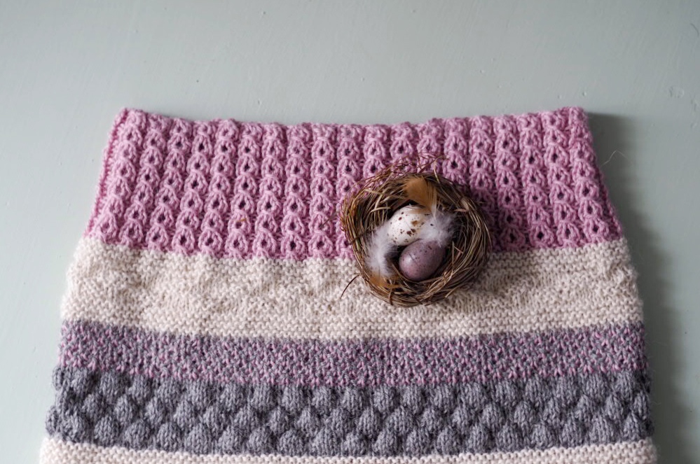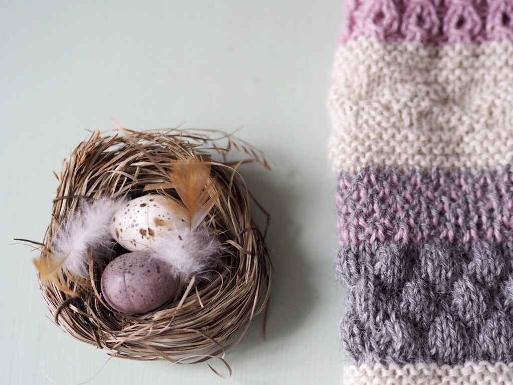 Om mønsteret i del 3: I denne delen jobber vi med to ulike strukturer. Den første har hentet inspirasjon fra fugleeggets spraglete overflate, og den andre fra formen på små, små fugleegg i et rede. Begge disse teknikkene er effektfulle og morsomme å strikke – men ikke spesielt vanskelige.