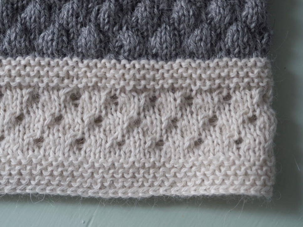 4. omg (hullrad): 2 r, *2 r sm, 1 kast, 2 r*, gjenta *-* til 2 m gjenstår, 2 r sm, 1 kast.