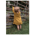 Kjolen strikkes ovenfra og ned med rundt bærestykke – men først frem og tilbake for å lage splitt i nakken. Når du har satt av masker til ermer, strikkes hullmønsterbord før du øker til skjørtet. Nederst på skjørtet strikkes rysjekant, og rundt halsen lages en i-cord kant. Kjolen er tettsittende, og bærestykket har ikke mye bevegelsesvidde, så pass på å måle overvidden på barnet og velg størrelse ut fra denne så du er sikker på å få riktig størrelse.