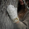 Kvister av bulmeurt pynter mansjettene på de hekseaktige vottene med navnet Mara. De er varme og romslige med en latvisk flette som pynt nederst på kanten.