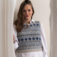 Denne vesten strikkes nedenfra og opp med klippemasker. Den har en ledig passform og vil holde deg god og varm kjølige sommerkvelder eller tidlige morgener. Vesten har vrangbord med vridde masker og mønster med fire farger som er inspirert av himmelen og havets blå skiftninger.