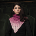 Halsen er strikket med tre tråder Fin Mohair Silke hold sammen. Den har v-form med flette og perlestrikk foran, en v-form med perlestrikk på ryggen og en deilig ribbestrikket hals. Du begynner med å strikke bak- og forstykket hver for seg frem og tilbake, før du setter dem sammen for å strikke rundt, former skuldrene og avslutter med ribb.